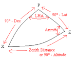 Obtaining a Position Line The difference between the True (TZD) and Calculated (CZD) Zenith Distances is the Intercept. TRUE, TINY, TOWARDS If the TZD is less than the CZD then the assumed position must be moved in the direction of the body by the amount of the Intercept. This gives a position of the correct distance from the body. It is known as the Intercept Terminal Position or ITP. As the radius of the circle is normally very large, it is considered to be a straight line near this point. A line at 90 to the direction of the body is the Position Line. Combining Position Lines A single Position Line must be combined with other observations for a fix. This can be achieved using a plotting sheet and then transferring the ITP by the distance to the next sight and redrawing the Transferred Position Line in the same direction as the original. For Sun sights, it is more usual to calculate the ITP of a morning sight and then calculate the transferred position for the Sun's Meridian Passage (Noon.) The difference between calculated and observed latitudes provides a longitude using “Plane Sailing.” With a little practice, this will be found to be a faster, not to mention more accurate method. For Star Sights, many people use a single position and then plot the Position Lines without allowing for the vessel's movement. This may appear a sloppy practice but a few miles error mid-ocean is usually irrelevant. Even if the position at sunset was perfect, there is no guarantee that the position an hour later is within a mile. Indeed even if the position agrees perfectly with a GPS position, there is no guarantee that an intervening military operation has not thrown the GPS position out let alone a fault in the equipment/ aerial. “I am about here,” is a far safer assumption than “My wheelhouse is/ was within 10m of this position.” |
